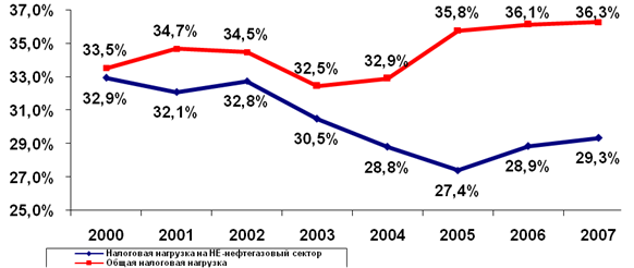 Рис.2. Динамика налоговой нагрузки на экономику в целом и на ненефтегазовый сектор (% ВВП)[26]
