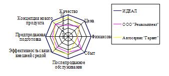 Рис. 6. Многоугольник конкурентоспособности предприятий обслуживающих автомобили на локальном рынке г. Белорецка