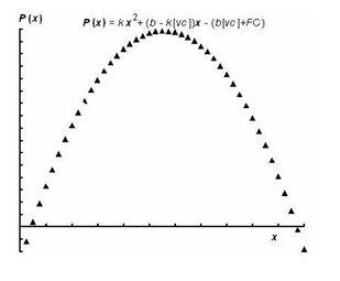На рисунке 10, иллюстрирующем поведение функции Р(х), хорошо видно, в каких точках, то есть при каких ценах х, парабола прибыли Р(х) пересекает ось аргументов, что означает нулевую прибыль.