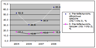 Из табл. 3.1 видно, что прибыль и выручка возросли в 3 раза по сравнению с 2005 годом. Изменение претерпели и рентабельность оборотных средств и рентабельность продаж (см. рис. 3.1). На рис.3.1 видно, что в 2005 г. и в 2008 г. показатели рентабельности наилучшие: рентабельность оборотных средств 52,9% и 63,8% соответственно, и рентабельность продаж – 17,1% и 16,6% соответственно, что вызвано сбалансированным сочетанием прибыли и суммы оборотных активов (соотношение 1:2), а также прибыли и выручки (соотношение 1:6).