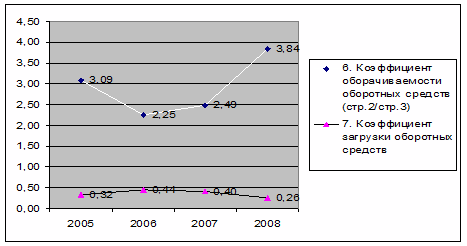 Источник: собственная разработка на основании данных бухгалтерских балансов за 2005-2008 гг. Что касается коэффициентов оборачиваемости оборотных средств и загрузки, то они находятся в обратной зависимости друг от друга (см. рис. 3.2). Лучшее управление оборотными средствами прослеживается в 2005 г. и 2008 г., когда коэффициенты оборачиваемости самые большие - 3,09 и 3,84 соответственно, коэффициенты загрузки оборотных средств самые маленькие – 0,32 и 0,26 соответственно.