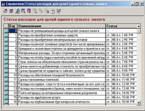 Все расходы предприятия формируются в разрезе статей расходов, соответствующих ст. 346.4. НК РФ (рис. 4). Для этого в документах, отражающих возникновение расходов, добавлена возможность выбора статей расходов для целей единого сельхозналога. Доходы формируются по видам продукции или по статьям прочих доходов и расходов в соответствии со ст. 346 п.2 НК РФ.