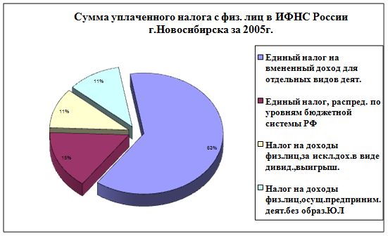 Доля поступлений в бюджет в разрезе отдельных видов налогов на доходы представлена на рис 3.2 «Сумма уплаченного налога с физ. лиц в ИФНС России г.Новосибирска за 2005 г.» Из него видно, что сумма уплаченных налогов распределилась следующим образом. Наибольшую долю занимает Единый налог, распред. по уровням бюджетной системы РФ – 16%, Налог на доходы физ.лиц, осущ. предприним. деят. без образ.ЮЛ – 11%, Налог на доходы физ.лиц,за искл.дох.в виде дивид.,выигрыш – 11%, а доля ЕНВД в 2005 г. составляла 62%