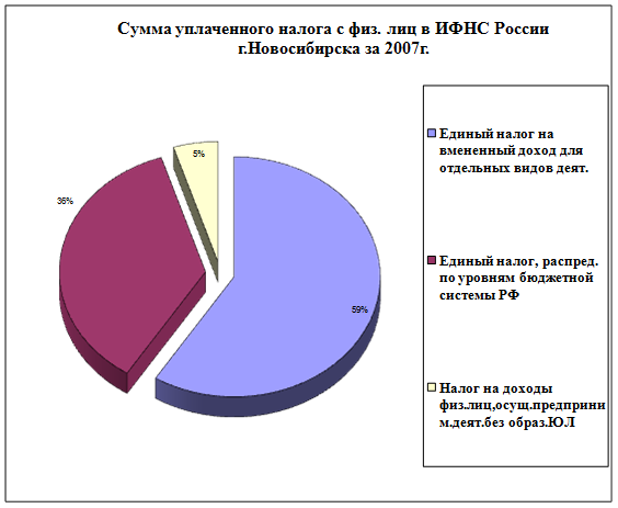 В 2006 г. рисунок 3.3 показывает резкий спад поступлений в бюджет по Единому налог, распред. по уровням бюджетной системы РФ его доля – 5%, а по налогу на доходы физ.лиц,осущ.предприним.деят.без образ. Юридического лица всего 1%, ЕНВД составил 94% но, начиная с 2007 года (что подтверждает Рисунок 3.4. «Сумма уплаченного налога с физ. лиц в ИФНС России г. Новосибирска за 2007г») резко возрастает доля как единого налога, так и налога на доходы частных предпринимателей.