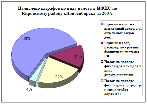 Рис. 3.6. Начислено штрафов по виду налога в ИФНС по Кировскому району г. Новосибирска за 2007г.