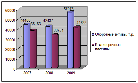 Рис. 4. Соотношение оборотных активов и краткосрочных пассивов Мамадышского РайПО за 2007 – 2009 гг., т.р.