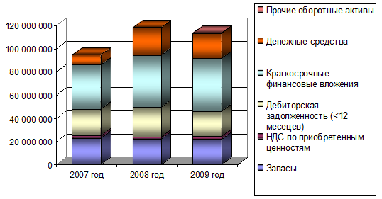 Оборотные средства являются неотъемлемой частью активов любого предприятия. Их абсолютная величина и доля в структуре активов влияют на эффективность работы и на финансовую устойчивость фирмы. Наибольшей суммы оборотные активы достигли в 2008 году. (118 348 271 тыс. руб.) В 2009 году их сумма уменьшилась на 4%, при этом в целом за рассматриваемый период сумма оборотных средств выросла на 20%.