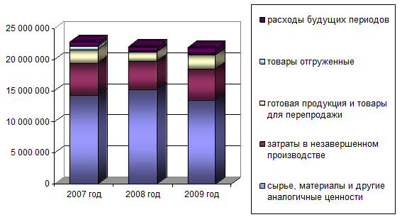 Существенную часть в структуре оборотных активов занимают запасы, их удельный вес в 2009 году составил 19%. Предприятие стремиться к сокращению запасов и с 2007 года их сумма уменьшилась на 4%.
