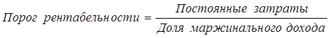 Рассчитывается порог рентабельности отношением суммы постоянных затрат в составе себестоимости реализованной продукции к доле маржинального дохода в выручке:
