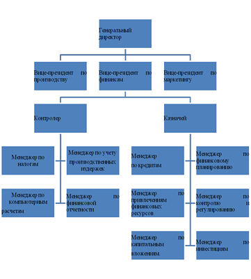 Основным лицом, отвечающим за организацию финансового менеджмента предприятия будет являться вице-президент по финансовым вопросам. Он, как правило, должен входит в состав Совета директоров. Ему будут подчинены два функциональных менеджера — контролер и казначей[1]. Четких разграничений в работе контролера и казначея не существует, их должностные обязанности на предприятии будут различаться в зависимости от политики, проводимой руководством предприятия и персональных качеств.