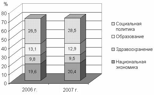 Это обусловило основные отклонения в функциональной структуре расходов консолидированного бюджета. В 2007 году по сравнению с 2006 годом на 0,8 процентных пункта выросла доля расходов бюджета на поддержку национальной экономики при сокращении удельного веса расходов на жилищные и коммунальные услуги – на 1 процентный пункт, на здравоохранение – на 0,3 п.п., рисунок 2.2.