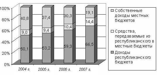 Доля местных бюджетов в доходах и расходах консолидированного бюджета страны является одним из критериев бюджетной децентрализации. В последние годы для бюджетного процесса республики было характерно повышение уровня централизации ресурсов в республиканском бюджете, рисунок 2.3. Удельный вес доходов республиканского бюджета (без ФСЗН) в доходах консолидированного бюджета в 2007 году составил 66,5% вместо 50,1% в 2004 году. В формировании доходной части местных бюджетов значительную роль играют безвозмездные поступления из республиканского бюджета. В 2007 году финансовая помощь местным бюджетам составила 14,4% всех доходов этих бюджетов.