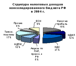 Как видно из рисунков, в структуре налоговых доходов консолидированного бюджета наибольшую долю в 2004 г. занимали поступления от НДС, налога на прибыль организаций и таможенных пошлин (21%, 18% соответственно). При этом более чем на 60% налоговая часть федерального бюджета формировалась за счет НДС и таможенных пошлин. Суммы поступлений от налога на прибыль организаций и НДПИ обеспечивали еще 20% налоговых доходов.
