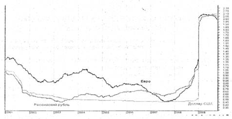Подтверждением необходимости использования производных финансовых инструментов могут стать графики динамики дневной рисковой стоимости, рассчитанной на основании данных 2000-2009 гг. (рисунок 1), которые подтверждают тенденцию роста рисковой стоимости внешнеэкономических контрактов, заключенных в евро и российских рублях и относительную ее стабилизацию по долларовым контрактам в 2008 году. В 2009 году рисковая стоимость экспортно-импортных контрактов, заключенных в различных валютах выровнялась, что обусловлено переходом Национального банка Республики Беларусь на новый способ курсообразования, основанный на использовании валютной корзины [11, с. 17]