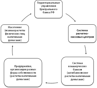 Из приведенной схемы видно, что налично-денежный оборот начинается в расчетно-кассовых центрах Центрального банка РФ. Наличные деньги переводятся из их резервных фондов в оборотные кассы, тем самым они поступают в обращение. Из оборотных касс РКЦ наличные деньги направляются в операционные кассы коммерческих банков.