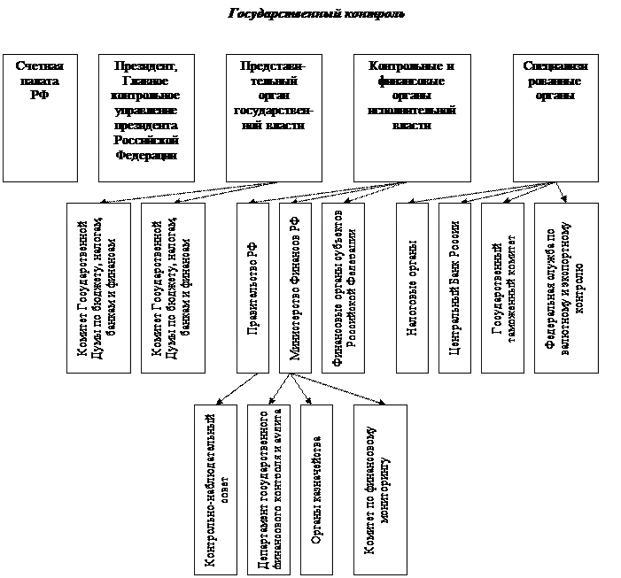 В Российской Федерации государственный финансовый контроль осуществляется системой органов государственной власти в рамках своих полномочий – согласно указу Президента РФ «О мерах по обеспечению государственного финансового контроля в РФ» ( в редакции от 18.07.2001 г.) в целях надлежащего контроля за формированием государственных доходов и рациональным их использованием, а также улучшения взаимодействия и координации деятельности контрольных органов, государственный финансовый контроль возлагается на Счетную палату РФ, Центральный банк РФ, Министерство финансов РФ, Министерство по налогам и сборам, Государственный таможенный комитете, Федеральную службу России по валютному и экспортному контролю, контрольно-ревизионные органы федеральных органов исполнительной власти, а также на другие органы, осуществляющие контроль за поступлением и расходованием средств федерального бюджета и федеральных внебюджетных фондов.