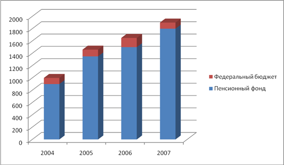 В России в 2007 году насчитывалось около 38,5 млн. пенсионеров, что составляет более 27 % населения. Другими словами. Благосостояние четверти населения страны напрямую зависит от системы пенсионного обеспечения. Рост расходов бюджета на выплату пенсий в 2007 году составил примерно 15,6 % как и в 2006 году. В 2007 году на выплату пенсий из пенсионного фонда РФ было направлено 1725 млрд. руб. При этом из федерального бюджета на финансирование выплат пенсий было выделено 959,7 млрд. руб. [18]