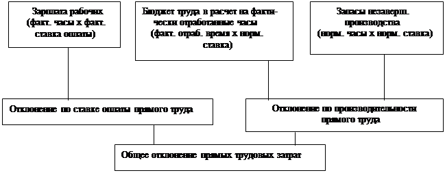 Отклонения прямых трудовых затрат. Общее отклонение прямых трудовых затрат определяется как разница между фактическими затратами труда и бюджетными затратами труда на произведенные единицы продукции за исключением брака (как окончательного, так и исправимого).