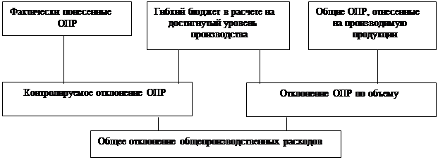 Анализ отклонений общепроизводственных расходов отличается по уровню сложности. Сначала вычисляется общее отклонение общепроизводственных расходов (ОПР), которое определяется как разница между фактическими ОПР, имевшими место, и бюджетными ОПР., начисленными (отнесенными на производимую продукцию) с использованием коэффициентов переменных и постоянных ОПР. Затем общее отклонение подразделяют на две части: контролируемое отклонение ОПР и отклонение ОПР по объему.