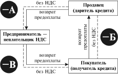 –А — Деньги возвращаются к Предпринимателю. Продавец корректировки не производит, поскольку одна из сторон (Предприниматель) не является плательщиком НДС. Налоговый кредит перешел от Продавца к Покупателю.
