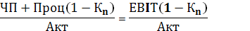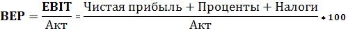 С позиции всех заинтересованных лиц (государства, собственников и кредиторов) общая оценка эффективности использования совокупных ресурсов производится на основании показателя рентабельности совокупного капитала, который определяют отношением общей суммы брутто-прибыли и до выплаты процентов и налогов (EВIТ) к средней сумме совокупных активов предприятия за отчетный период: