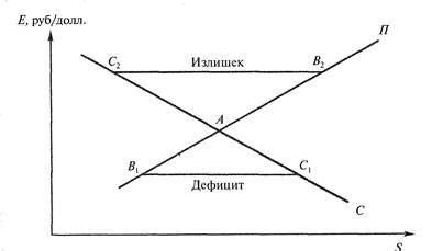 1. При фиксированном валютном курсе изменение спроса и предложения на иностранную валюту ведет к образованию излишка или дефицита валюты на рынке (рис. 1).