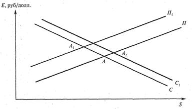 Рис. 1 - Равновесие на валютном рынке при фиксированном валютном курсе: £', руб/долл. - валютный курс; S - расходы на импорт и доходы от экспорта; П - кривая предложения; С - кривая спроса; А - точка равновесия