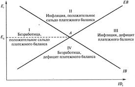 Равновесный валютный курс (Еq) определяется точкой пересечения (А) кривых внутреннего (IB) и внешнего (ЕВ) равновесия. Равновесный валютный курс в точке А одновременно является и оптимальным валютным курсом при данном состоянии экономики.
