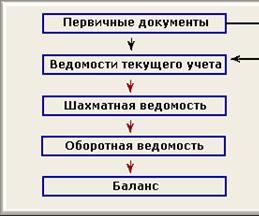 В качестве учетных регистров при данной форме ведения бухгалтерского учета применяются восемь ведомостей для учета имущества организации и источников его образования и одна шахматная ведомость (В-9) для обобщения данных этих ведомостей и проверки правильности произведенных в них записей по счетам бухгалтерского учета. Данный способ ведения бухгалтерского учета предусматривает следующий порядок записей (см. рис. 2.1).