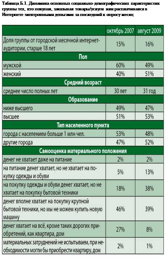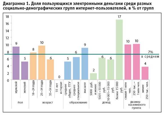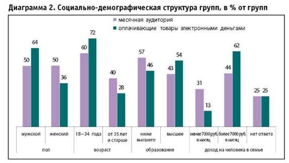 Если смотреть на социально-демографическую структуру группы пользующихся электронными деньгами, вырисовывается следующий портрет: это, скорее всего, мужчина в возрасте до 34 лет, с высшим образованием, среднемесячным доходом на человека в семье не менее 7 тыс. руб.