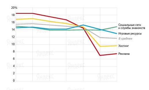 Контекстная реклама и хостинг — услуги буднего дня. Они связаны с работой, и вебмастера, которые за них платят, в выходные предпочитают отдыхать. За рекламу по будням платят в 2,4 раза чаще, чем по выходным, за хостинг — в 1,7 раза.