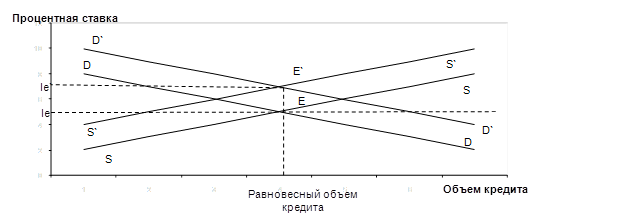 Рассмотрим, как изменения в спросе и предложении повлияют на рыночные процентные ставки. Предположим, что заемщики ожидают увеличение темпа инфляции и снижения реальных издержек заимствования. При данной ставке iе процента спрос на кредит способен превзойти предложение. Кривая спроса на кредит сдвигается вправо, из положения DD в положение D`D` (рисунок 2). Превышение спроса будет оказывать давление в сторону повышения процентной ставки. С другой же стороны предположения кредиторов об увеличении темпов инфляции, т.е. снижению в будущем доходности их активов приведут к снижению предложения кредита при данной ставке процента, что усилит избыточный спрос. Кривая предложения сдвигается влево, в положение S`S`. Часть заемщиков лишается возможности получить кредит, другая часть вынуждена брать кредит по более высокой в сравнению с действующей ставкой процента. В результате на рынке установится новый более высокий уровень процентных ставок iе. При этом равновесный объем кредита в экономике может не измениться по сравнению с предыдущим состоянием рынка.