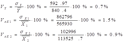 Зная средние значения и средние квадратические отклонения признаков, рассчитаем коэффициенты вариации для оценки однородности исходных данных