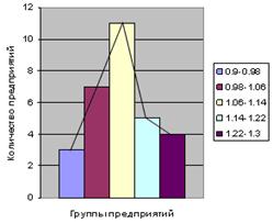 Интервальный ряд распределения показал, что наибольшее количество предприятий имеют эффективность использования основных производственных фондов от 1.06 до 1.14 млн. руб.