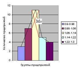 2. Постройте графики полученного ряда распределения. Графически определите значения моды и медианы. По данным таблицы 1 строим гистограмму распределения предприятий по эффективности использования основных производственных фондов (рис.1).