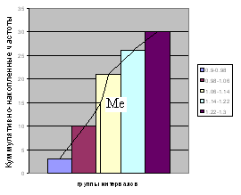 Модальным будет являться третий интервал, так как его кумулятивная частота равна 21 (3+7+11), что превышает половину суммы всех частот (30/2=15). (Рис. 3.)