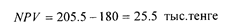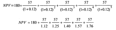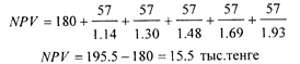Если необходимая норма дохода равна величине дохода, который инвесторы ожидают получить от инвестиционного проекта, и предприятие принимает этот проект с чистой реальной стоимостью, отличной от нуля, стоимость долгосрочных финансовых инвестиций будет увеличиваться, то есть до оцениваться. Например, предположим, что необходимая норма дохода равна 12% после налогообложения, величина инвестиций составляет 180 тыс.тенге и ежегодные выплаты в течении пяти лет 57 тыс.тенге, текущая стоимость будет равна: