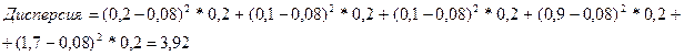 3. Далее определяем дисперсию, как сумму произведений всех квадратов разниц между средней и фактической их величиной на соответствующую величину вероятности данного события: