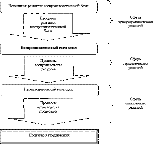 Пользуясь этой классификацией, можно соответствующим образом структуризовать и решения, принимаемые на уровне руководства предприятия. Решения, касающиеся использования имеющегося потенциала производственной базы, целесообразно относить к тактическим (рис. 1). Наиболее важные решения, касающиеся процессов формирования (создания, пополнения, изменения) потенциала, можно отнести к стратегическим. Наконец, решения, которые определяют потенциал для развития воспроизводственной базы, можно было бы назвать суперстратегическими.