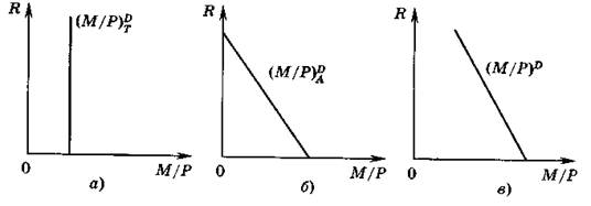 Рис. 3. Виды спроса на деньги: а — трансакционный и из мотива предосторожности; б — спекулятивный; в — общий