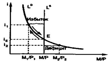 Допустим, что процентная ставка по каким-либо причинам оказалась выше равновесного уровня (i1 > iE), что означает рост альтернативной стоимости хранения денег. Спрос на наличные деньги в этом случае упадет до М1/Р1 (движение по кривой). Станут более привлекательными срочные вклады, облигации, акции и другие альтернативные финансовые активы. Избыток спроса на ценные бумаги, например облигации, вызовет повышение их курсовой стоимости, а следовательно, снижение процента их реальной доходности. В свою очередь наплыв «излишних» денег во вклады сделает их менее привлекательными для тех, кто аккумулирует деньги, что подтолкнет последних к снижению процентных ставок по срочным депозитам. В результате увеличится спрос на наличные деньги, облигации начнут активно продавать, а срочные депозиты переводить в текущие. Все это будет продолжаться до тех пор, пока спрос и предложение денег не уравновесятся на исходном уровне процентной ставки.
