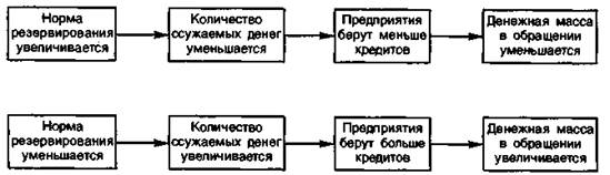 Средства, которые находятся в распоряжении любого коммерческого банка, делятся, как уже отмечалось, на две части: 1) деньги, которые банк может выдавать в виде кредитов; 2) резервы банка, хранящиеся в Центральном банке и устанавливаемые им в виде процента (нормы) от располагаемого объема средств.