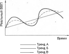 На рис. 1.1 наглядно продемонстрированы последствия применения фискальной политики. Тренд А показывает колебания экономической активности в рамках цикла. Заметны довольно большие изменения величины ВВП, уровня занятости, а значит, и цен за рассматриваемый отрезок времени относительно тенденции экономического развития (тренд Б). Вследствие воздействия инструментов фискальной политики в экономике не будет столь значительных колебаний данных величин, что свидетельствует о стабилизации (тренд В). Конечно, наиболее желанным вариантом исправления ситуации для экономики было бы полное совпадение трендов Б и В, но при помощи только фискальной политики добиться этого сложно.