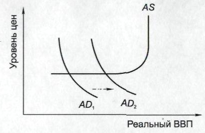 Если экономическая система находится в состоянии спада, то возникает необходимость в стимулирующей фискальной политике, прибегнув к которой правительство поощряет расходы и увеличивает реальный объем производства (ВВП). Используя модель «совокупный спрос — совокупное предложение», можно продемонстрировать смещение кривой совокупного спроса вправо (рис. 2.1). Совокупный спрос может переместиться из состояния AD1 в AD2 путем увеличения государственных расходов, снижения налогов или сочетания этих мер.