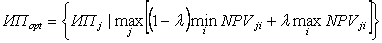 Критерий пессимизма-оптимизма Гурвица /10/ устанавливает баланс между критерием MAXIMIN и критерием MAXIMAX посредством выпуклой линейной комбинации. При использовании этого метода из всего множества ожидаемых сценариев развития событий в инвестиционном процессе выбираются два, при которых ИПj достигает минимальной и максимальной эффективности. Выбор оптимального ИП по показателю NPV осуществляется по формуле: