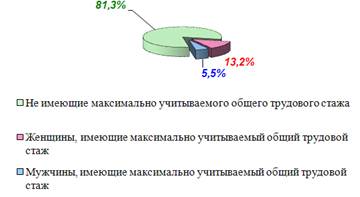 а) 18,7% пенсионеров по возрасту имеют максимально требуемый стаж: для женщин - 40 лет, для мужчин – 45 лет (рисунок 18);