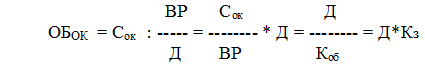 Длительность одного оборота (оборачиваемость оборотного капитала) в днях (ОБОК) определяется делением оборотного капитала Сок на однодневный оборот, определяемый как отношение объема реализации или выручки от продаж (ВР) к периоду в днях (Д) или же как отношение периода к числу оборотов (Коб):