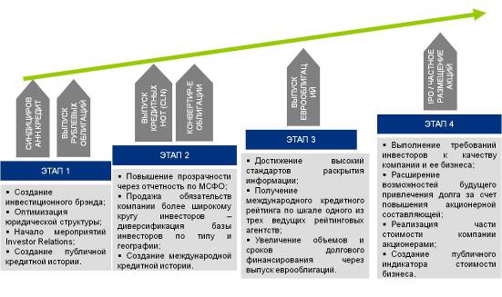 Существует определенная последовательность действий лизинговой компании, приведенная в диаграмме ниже (см. рис. 2.6.), которую необходимо пройти для финансирования через публичный долг. Поскольку данная последовательность действий приводит к увеличению стоимости компании, её второе название - лестница повышения стоимости компании.