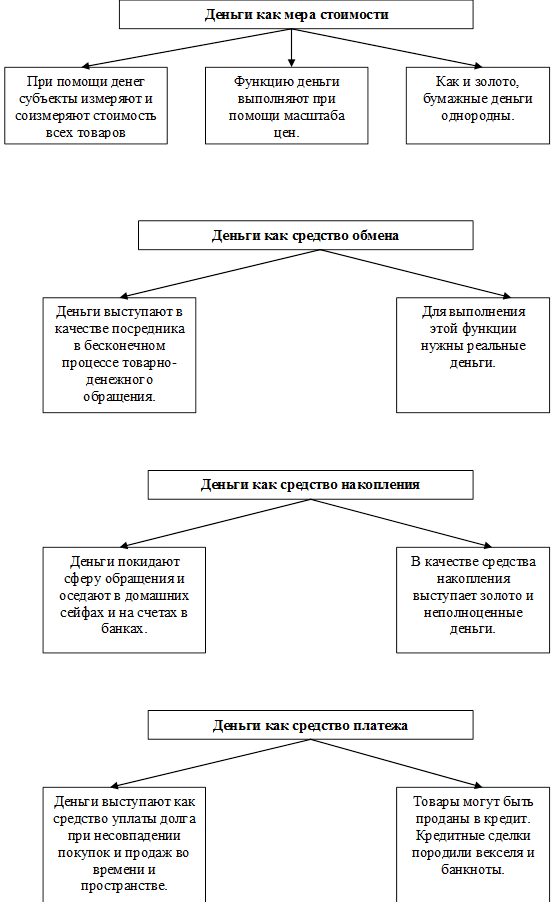 Для раскрытия сущности денег необходимо учесть их функции. Как известно, в российской экономике их пять, и каждая несет свою определенную значимость. В функции соизмерения стоимости деньги используются для установления товарных цен, для сопоставления выручки от реализации товаров с издержками на их производство. Выполнение деньгами средства обращения и платежа позволяет облегчить товарообмен, снизить издержки обращения. Благодаря выполнению деньгами функции средства накопления ускоряется формирование источников капитала для расширенного воспроизводства, происходит образование источников ссудного капитала. Они играют важную роль в процессах формирования, распределения и перераспределения национального дохода. Мировые деньги опосредствуют процессы аккумуляции и перераспределения мировых финансовых потоков, перелив капитала из одной страны в другую, обслуживают движение товаров и услуг между странами.