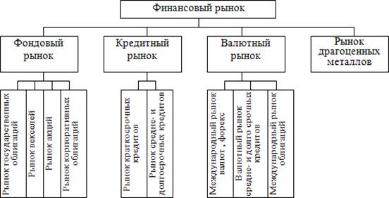 Понятие финансовый рынок является обобщённым. В действительности финансовый рынок состоит из нескольких отдельных самостоятельных сегментов, которые составляют его структуру. Структура финансового рынка – это совокупность его взаимосвязанных элементов, взаимодействующих между собой. В наиболее общем виде структуру финансового рынка можно представить в следующем виде (рис. 1).